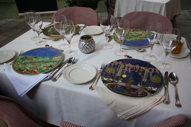 The table setting was so pretty, I loved the painted serving ware. We were seated in the outdoor courtyard, which was absolutely picturesque. I never went inside, but I saw photos and it reminded me of the Royal Palace in Madrid. Seriously fancy.